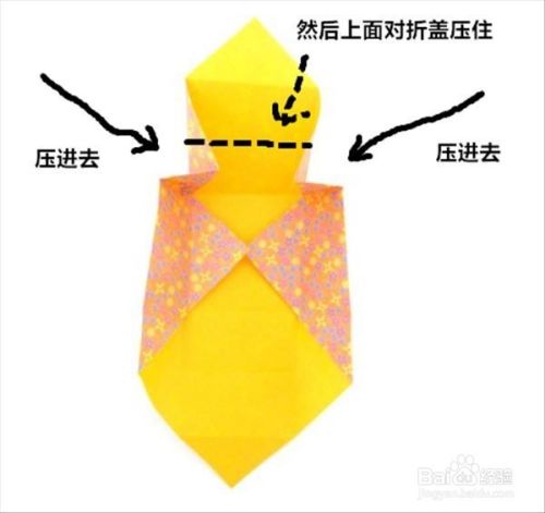 从上一步展开,如图把左右两边半竖起,手指把角压进来(这里不是胡乱一压,要根据原来的折痕往里收压好),然后上面的那面根据刚才的折痕对折下来,盖压这收进来的角。