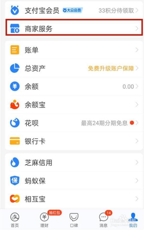 打开支付宝app,点击我的,点击商家服务