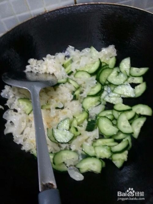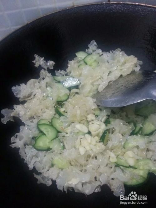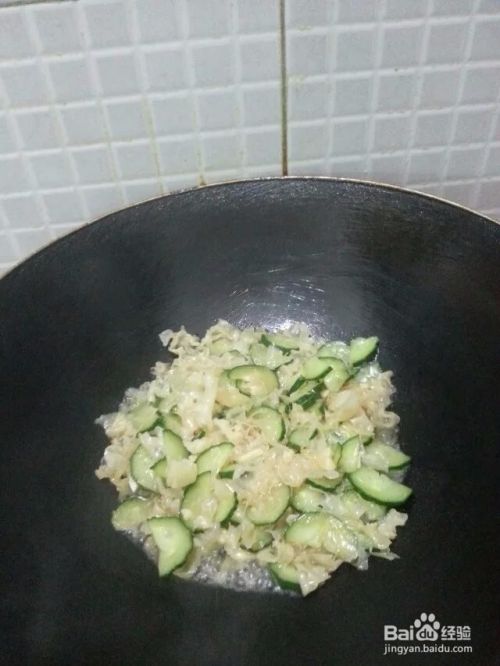 将黄瓜、蒜泥倒入加少许盐一起翻炒几分钟。