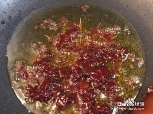 炒锅加香菜洋葱油,烧热加入适量郫县豆瓣酱。