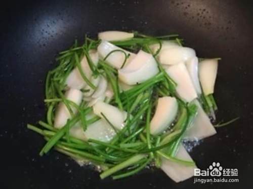 炒锅里食用油加热再加入洋葱和香菜梗。