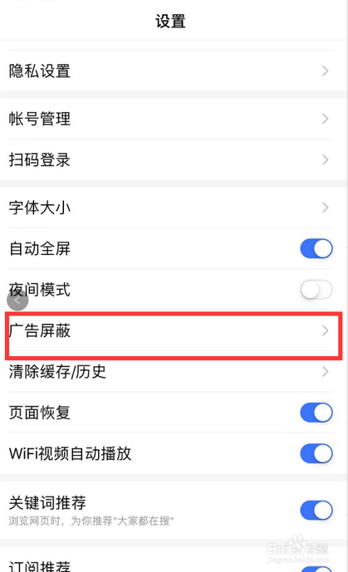 在设置主页下找到并点击【广告屏蔽】功能,进入广告屏蔽设置。