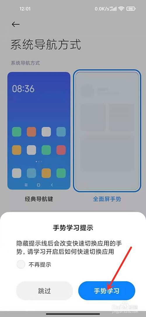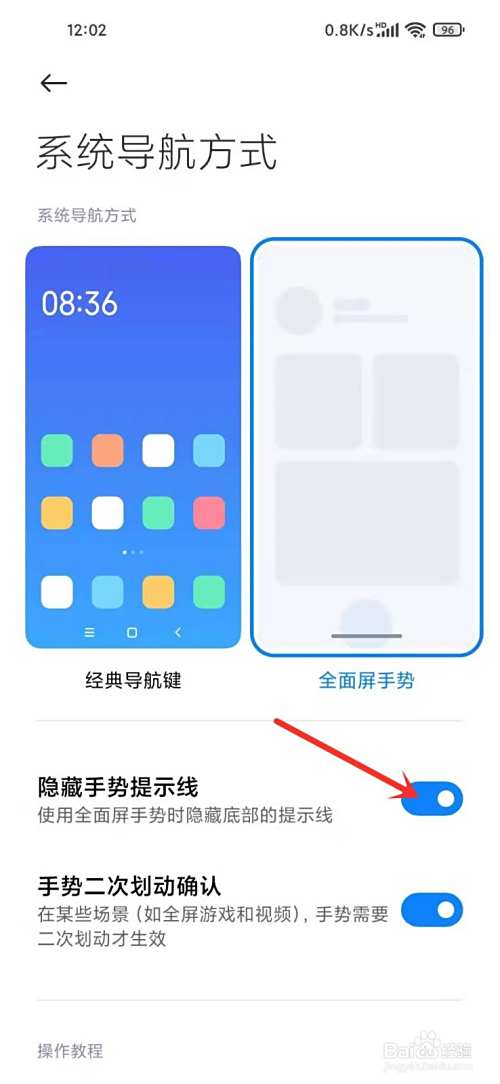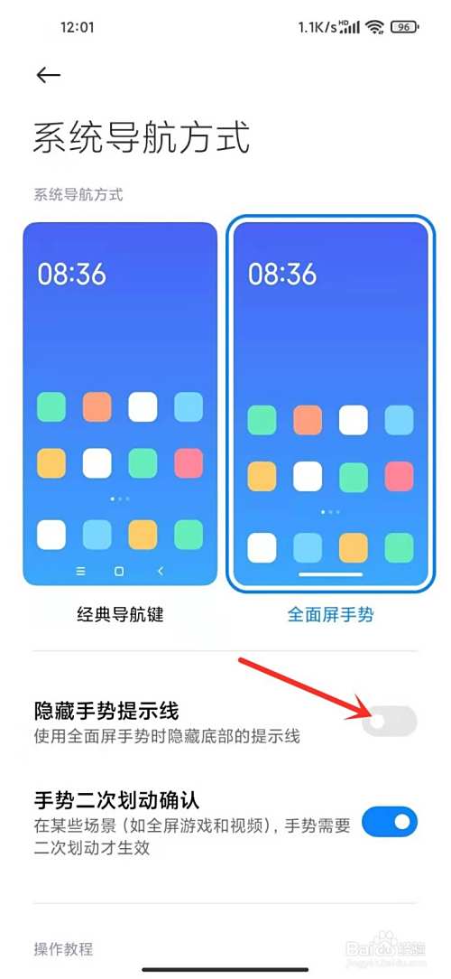 注意:初次关闭时,需要进入手势学习,否则横线无法关闭。