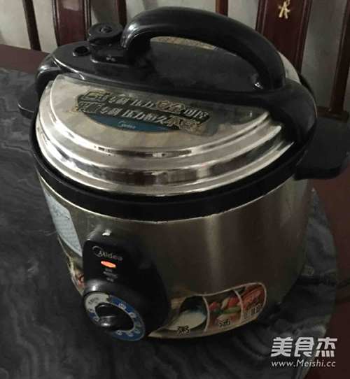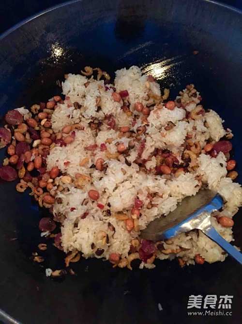 2此时先煮糯米,500克糯米加150克粘米,这样配起来,糯米不会太太太粘,会比较好一点点。水一定要比平时煮饭下的少,高于糯米一厘米就好。