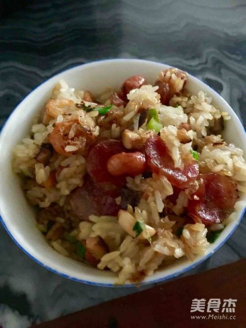 5油烧开后先放入虾仁跟腊肠,中火爆炒一会接着放入香菇,翻炒一会。再放入花生(咸炒花生我买的是外面现炒好的),再放入半茶匙的盐,翻炒一下。