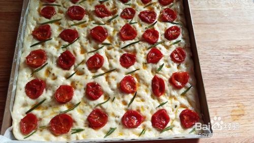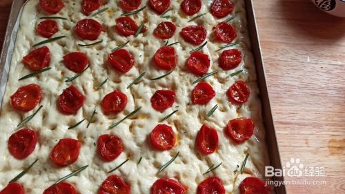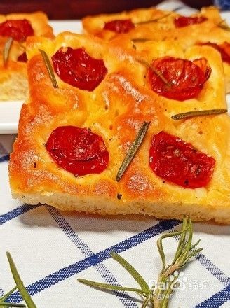 Focaccia 是意大利扁平面包,别看把面团摊在烤盘上比较扁平,但一经烘焙,就会升高。Focaccia 形状可以是圆的,也可以是正方或长方的,如果是方的,要把面团向四角抻好;Focaccia 面上插的材料不一定是油渍小番茄,可以是洋葱,也可以是蒜片、迷迭香、九层塔或黑橄榄片等。