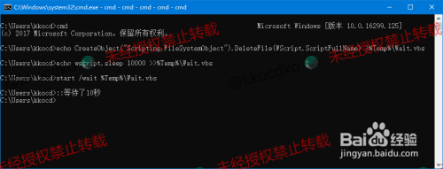使用vbs的sleep方法来实现延时(等待)。优点:能在旧系统中(例如xp)使用,且延时精度较高(1毫秒)缺点:代码行数较多,3行。