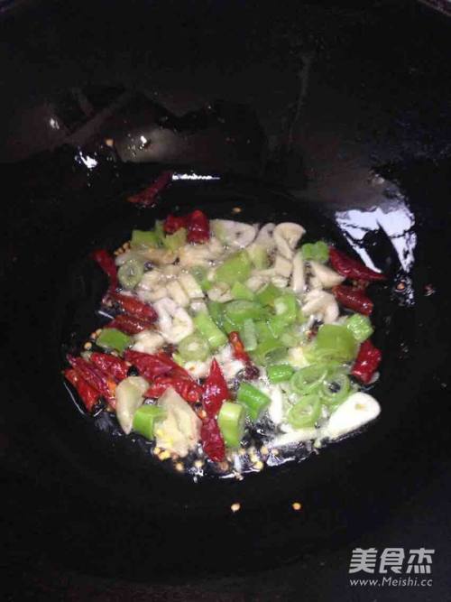 6锅中放油葱、蒜、辣椒、花椒、炒香