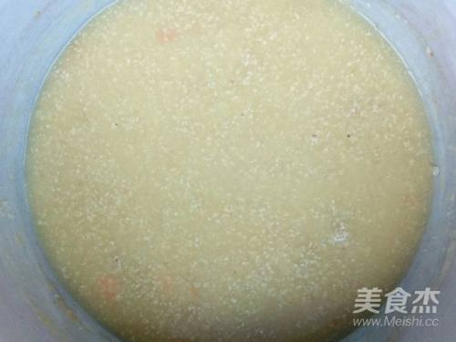 6接着把玉米面加少许冷水搅拌匀,倒入锅中搅匀,煮至地瓜八成熟。