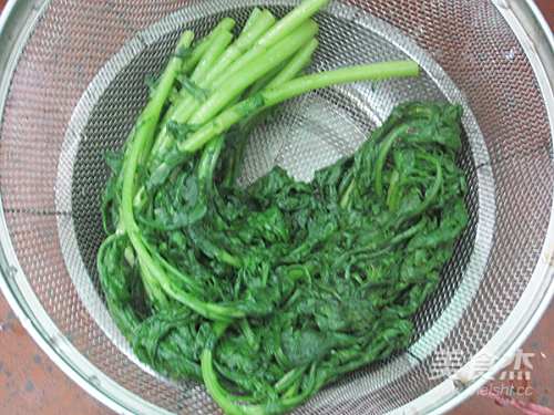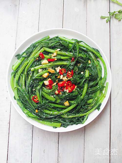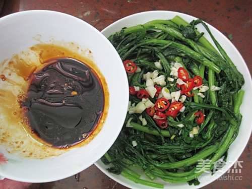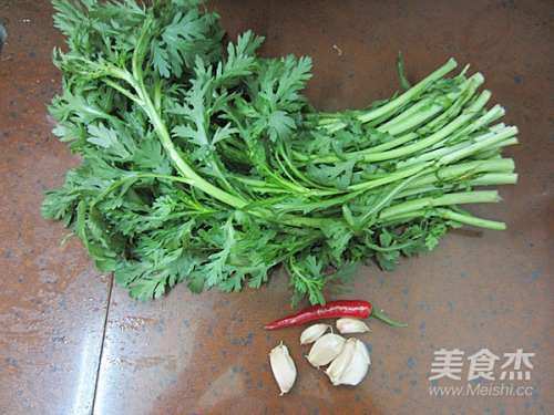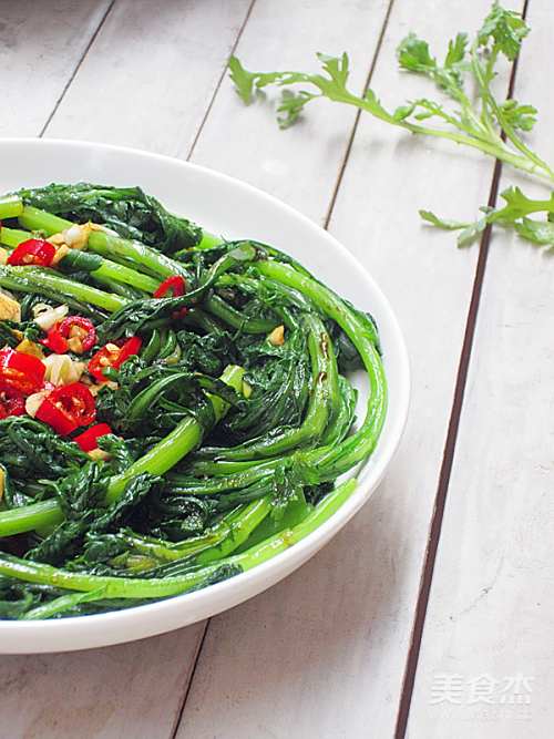 9茼蒿放入盘中,加入蒜粒、红椒粒