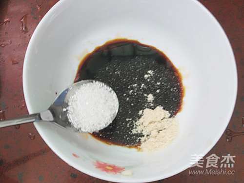 7取一小碗,加入生抽、白糖、鸡粉、醋拌均匀