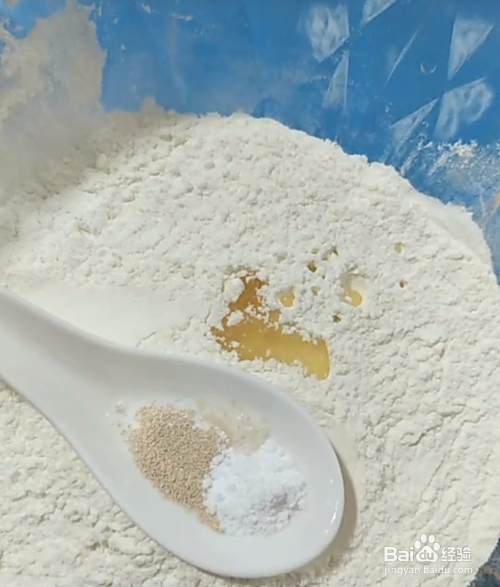 放入3克酵母粉,3克泡打粉,150克清水,和成面团。