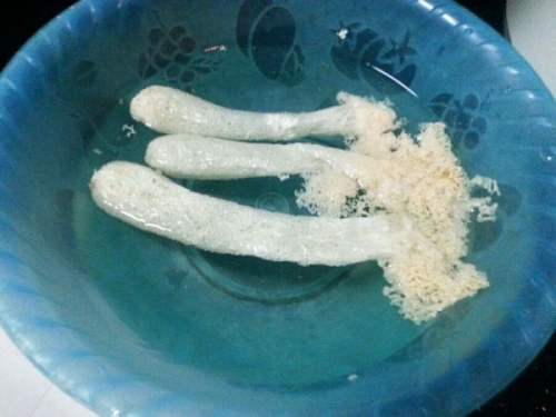 2用盐水泡发竹荪。待稍膨胀后,去除竹荪表面的白色杂质。剥离杂质时需小心,避免竹荪有所破损。