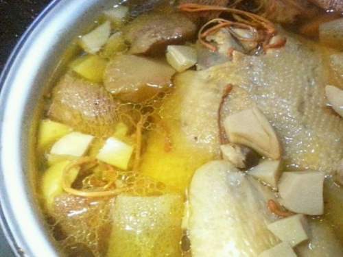 8飞水完毕后,需立刻用冷水冲凉肉块,再放人砂锅内炖汤。同时将辅料猴头菇,竹荪和虫草花放入。