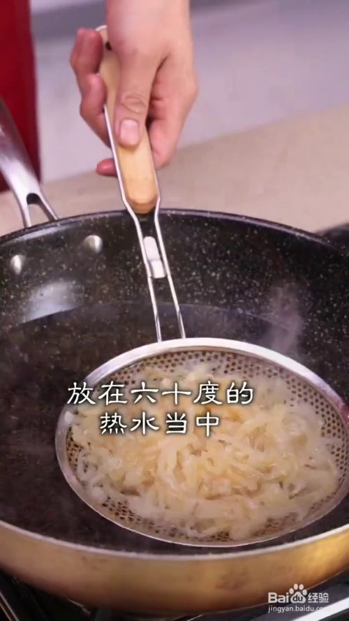 我们将白菜洗净,菜叶部分切成丝,海蜇提前泡去咸味,锅中放入烧至六十度,再放入海蜇焯烫三十秒左右