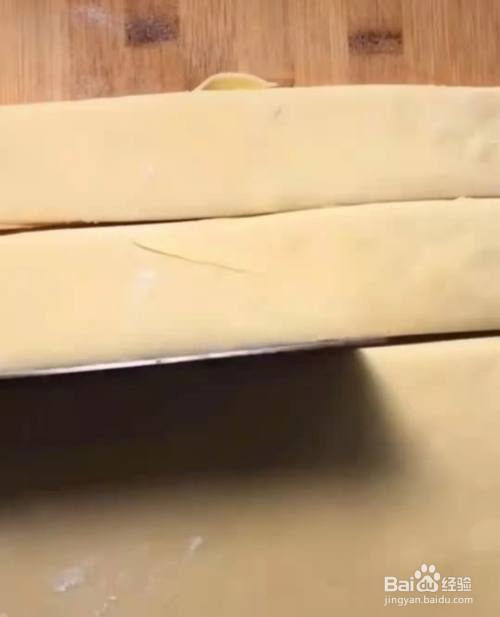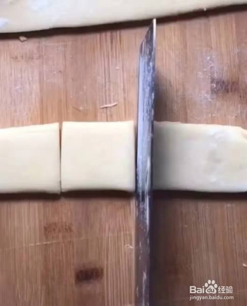 然后将步骤①的薄饼放在步骤②的两块薄饼中间,再切成两根手指宽的长条,每根长条都切成正方形小面剂。