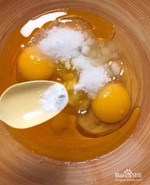 首先准备大碗做第一种面团,碗中打入鸡蛋、白糖、食用油、小苏打、面粉搅拌成棉絮状,再揉成光滑面团,松弛15分钟。