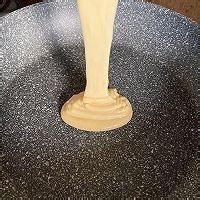 用中火加热平底锅,加热后把锅底放在湿抹布上放稍加冷却大概5秒左右,转小火,在一定高度(大约30cm)位置将面糊均匀的倒入锅里