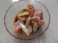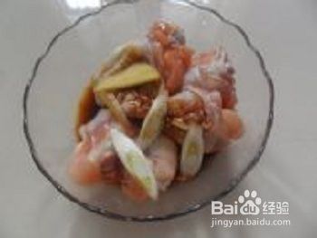 把鸡腿放进容器里倒些料酒、葱姜片腌制一会,去一下腥