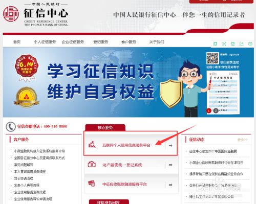 登录人民银行征信中心官网,如图步骤所示,点击互联网个人信用信息服务平台