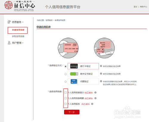 点击申请信用信息,选择信用信息,最好三个全选。点击下一步就可以了,身份验证码一般是24个小时内会以短信的形式发在你手机里。点击获取信用信息,输入身份验证码就可以了,可以看到自己