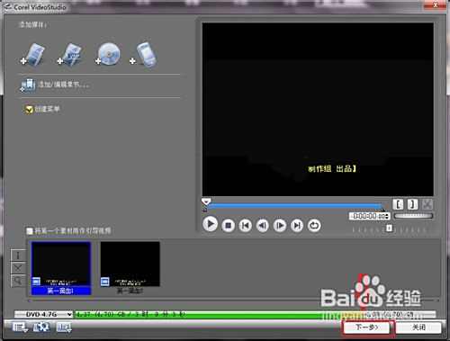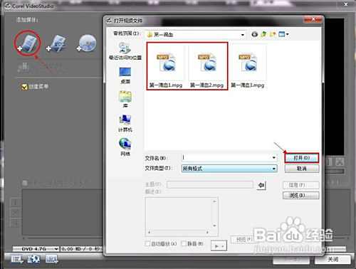 在打开的创建光盘对话框中点击添加视频,如图中圆框,弹出选择视频对话框,选中要编辑的视频,如“第一滴血”1、2集,“打开”