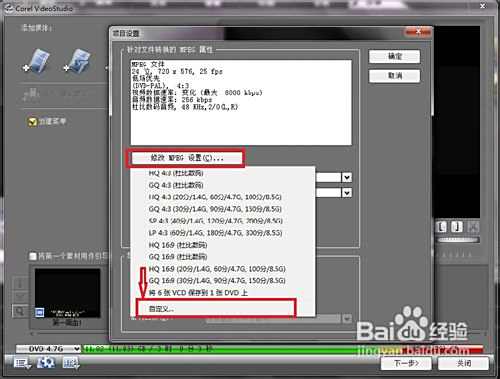在项目设置内点击“修改MPEG设置”,选取“自定义…”