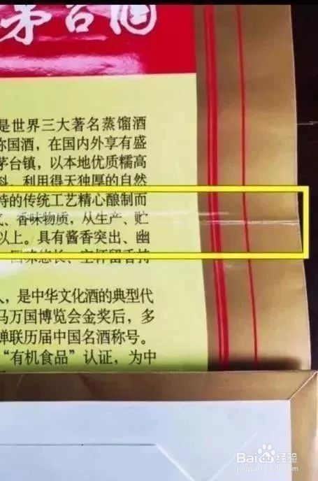 接着茅台酒瓶内防伪介绍书: 假茅台中间是没有明显折痕手工弯曲,真茅台则有一条明显折痕是由机器快速对折产生的爆裂痕迹,此种鉴别方法可适用于最近五年内的飞天茅台。