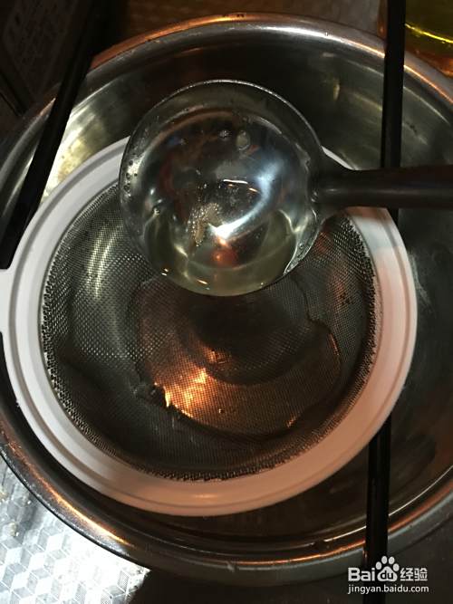 把水分熬干,猪板油开始出油,油变透亮,转小火熬,一边熬一边往外舀,拿滤网过滤到干净没水的盆内