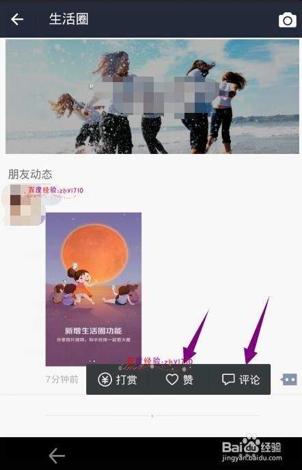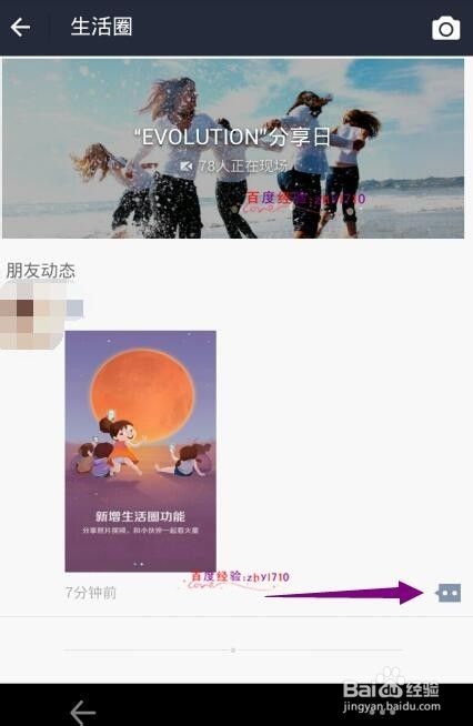 选择生活圈之后会进入到生活圈列表,在这个列表里我们可以看到好友发的动态,我们找到要打赏的动态,找到之后可以看到在动态的右下角会有一个标志,如图所示标志,我们单击该标志。