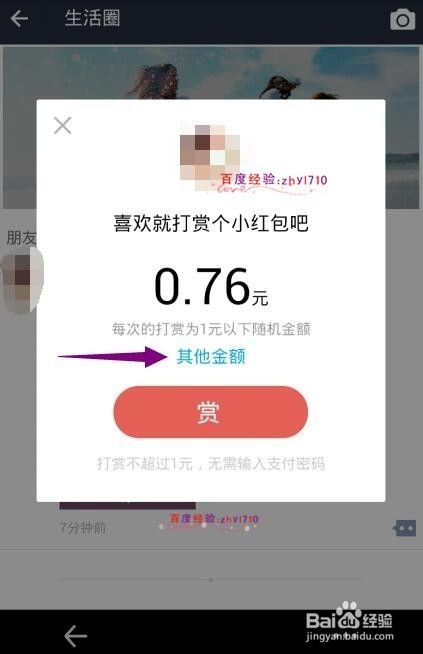 选择打赏按钮之后会弹出一个对话框,如图所示,这里要说的是,支付宝默认打赏的金额是在1元以下,所以每次点打赏都会出来一个金额,如果打赏的金额不满意的话,可以选择“其他金额”选项。