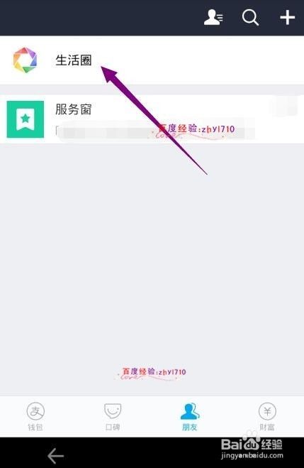 首先我们先打开支付宝钱包,然后进入到“朋友”面板,在这个面板上就会有一个“生活圈”选项,我们选择该选项。
