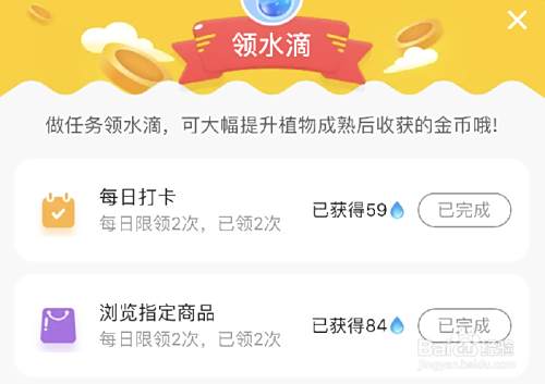每天我们可以通过完成2个任务合计四次获得水滴,以及好友浇水获得的水滴