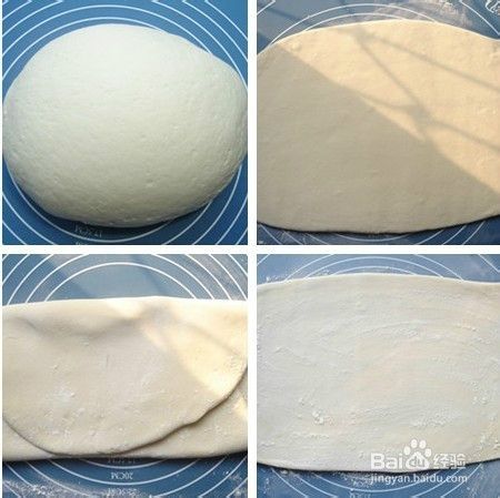 2,发酵好的面团可以掺点干面粉揉到面团变硬,然后擀成长方形的薄片。
