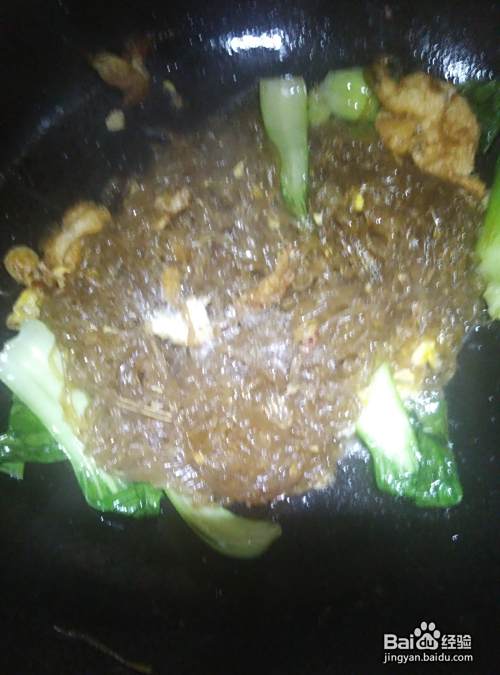 等油温上来,倒入鸡蛋快速搅开,再依次倒入粉丝、青菜。