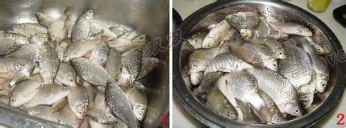 鲫鱼先洗净,去掉腮和内脏,控干水分。要嫌麻烦,可以直接将头弄掉,我为了好看,还是留着了!(图1、2)