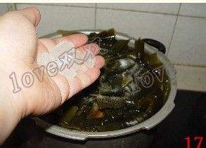 我放的时候忘记了放海带,所以将其全部放在了锅子的最上方。(图14)
