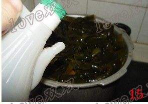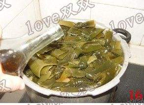 全部完成,在锅内加水,水没过海带即可。在锅内放入生抽少许、醋、料酒和盐。(图15、16)