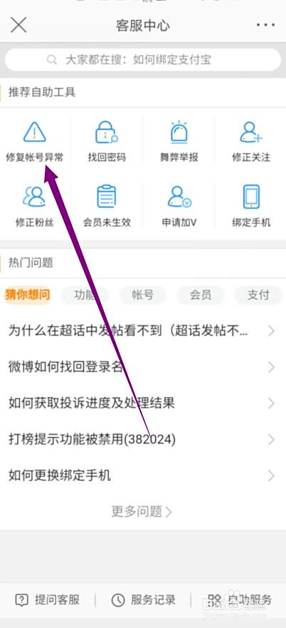 tips:在客服中心中点击“修复账号异常”。