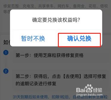 5、我们需要用30芝麻粒兑换此修复功能,点击确认兑换,再点击去使用就可以恢复一次逾期记录啦