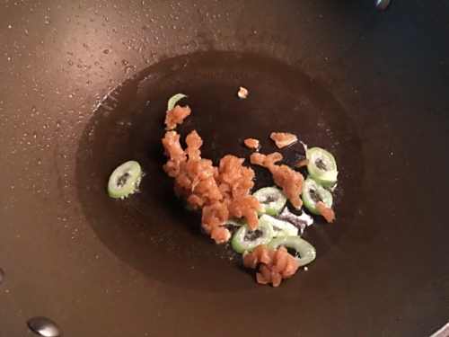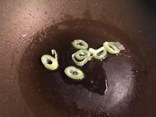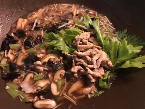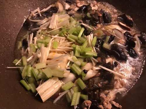 5翻炒片刻下入剖开切成小段的西芹和切成小段的金针菇。倒入大半碗水,并加入调味料调味。