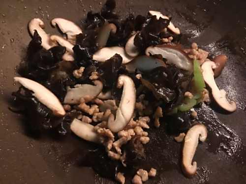 4肉末炒散后下入撕成小朵和切成薄片的香菇翻炒。
