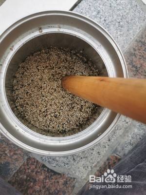 舂芝麻,我用的是奶粉罐子加擀面杖一定要趁热舂,也可以用研磨机或者破壁机的研磨杯,但是舂的好玩。如果舂不出来,就表示没炒到位 舂好后加糖搅拌