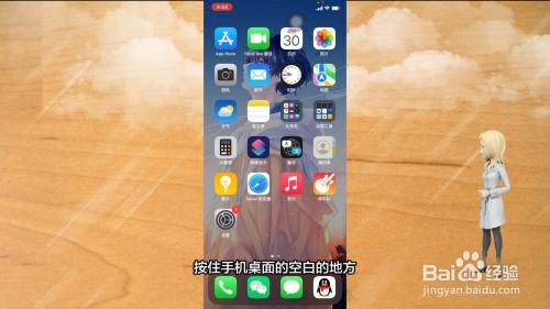 打开苹果手机进入到手机的桌面,按住手机桌面的空白的地方,按住两秒钟的时间后手机桌面上面的图标就会开始抖动。