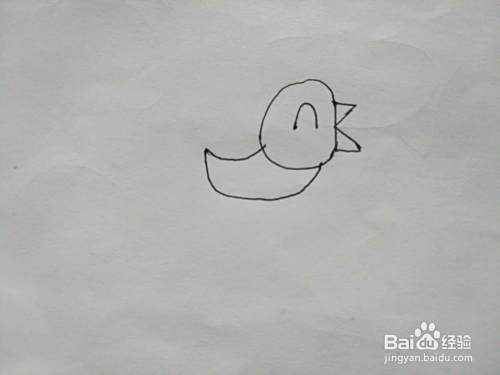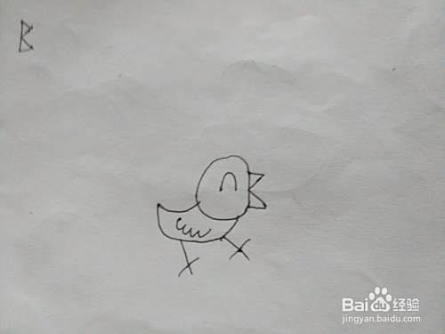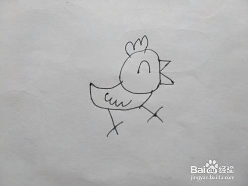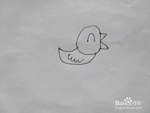 使用月亮似的身子,画的时候线条要流畅,身子顶端画出小鸡的屁股(也就是尖尖的位置),在身子里面用波浪线画出它的翅膀。