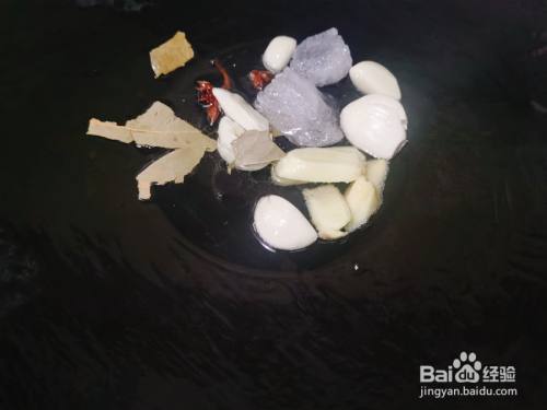 起锅烧油,油温六成热时放入生姜,八角,香叶,冰糖小火煎十秒钟。