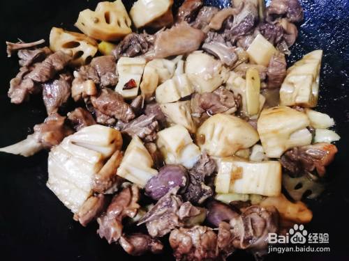 炒干鸭肉里面的水分后,加入少量料酒翻炒均匀,加入水,水一般盖住所有食材就好,盖盖子焖至收汁。
