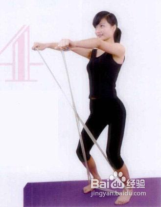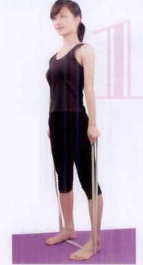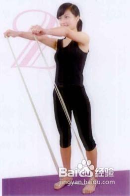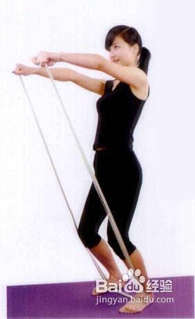 3、双腿膝关节微屈,用脚尖或脚掌中心踩住橡皮筋.同时双手紧握皮筋自体侧拉起。当上臂基本与地面水平时静止,坚持5—10秒后放下继续。1次15—20组,每天可练3次。