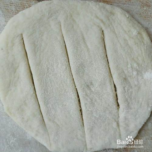 将和好的面团分成若干小剂子,再面板上加少许面粉,用擀面杖擀圆,在面皮上划三个口。