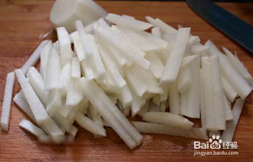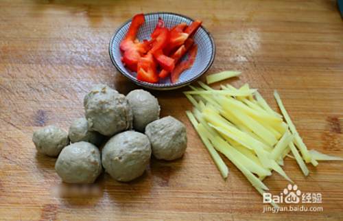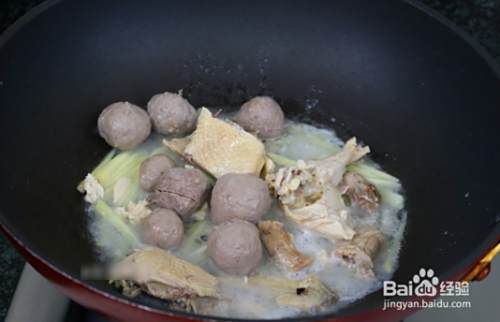 起锅烧油,下姜丝煸炒片刻。然后将咸鸡块和牛筋丸倒入锅中,大火煮沸。
